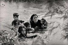 Uma mãe cruza o rio com os filhos durante a guerra do Vietname